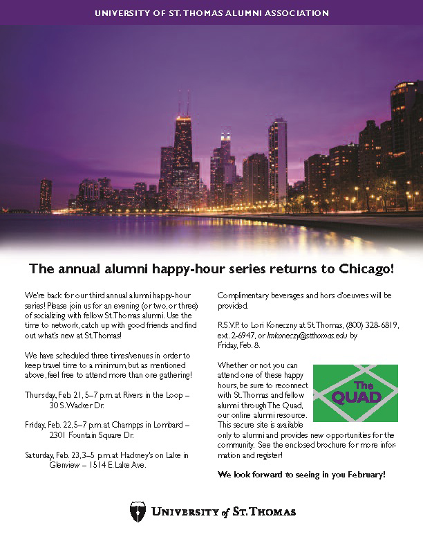 Graphic Design I created an invitation to an alumni event for the University of Saint Thomas using existing branding and an image of the skyline of Chicago. The flyer showing an image of the Chicago skyline and text regarding an alumni event.