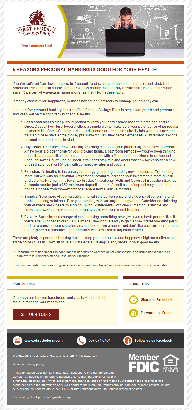 I designed and developed a series of emails for First Federal Savings Bank to match their existing branding and site design. This series of emails would each include one article with information related to banking and other services. The client requested that the newsletter include a strong call-to-action and easy social sharing.