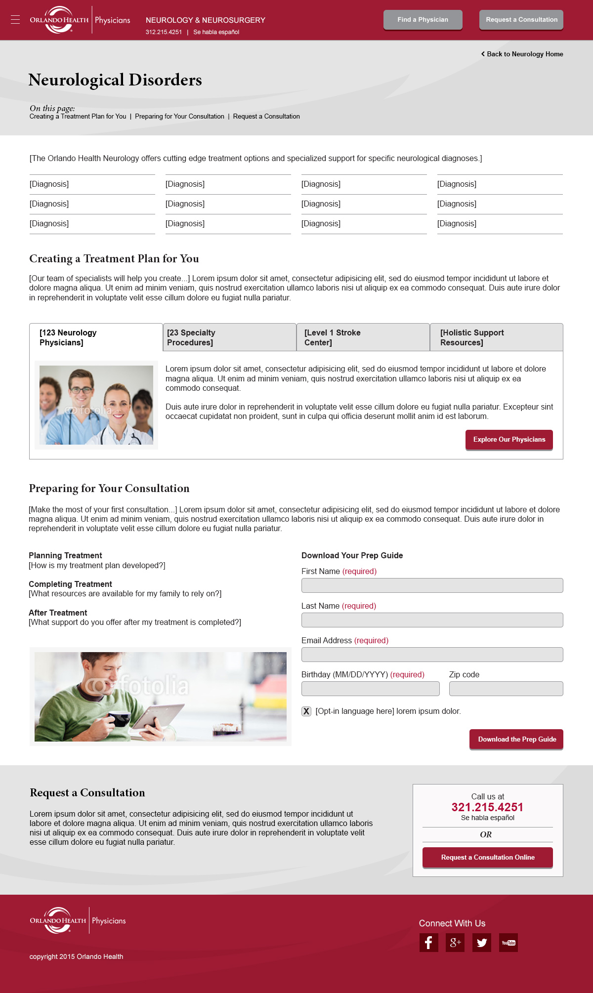 I created designs for inner pages of a microsite on neurological conditions based on a collaborative home page design and wireframes. The goal of this page was to educate the user about neurological assistance available at the hospital system and encourage them to supply contact information or register for an appointment.