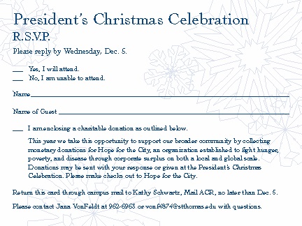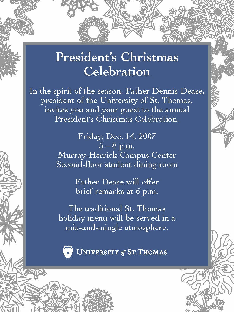 I designed an invitation and response card to the President’s Christmas Celebration at the University of Saint Thomas with images of snowflakes and using a metallic color.