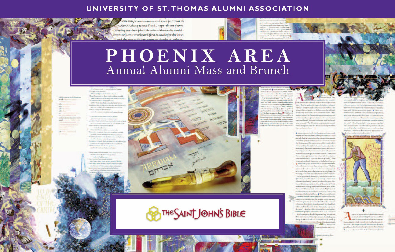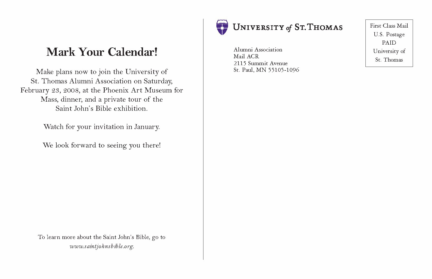 I designed a postcard to alert alumni from the University of Saint Thomas to an upcoming event showing the Saint John’s Bible, an illustrated bible. I was asked to incorporated several images from the bible in the postcard and alter previous postcard branding to fit this postcard.